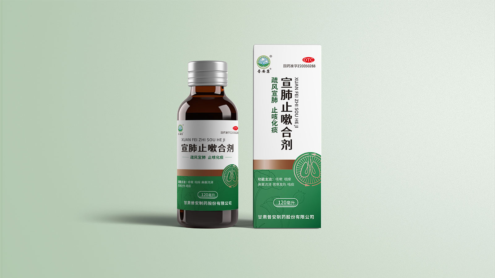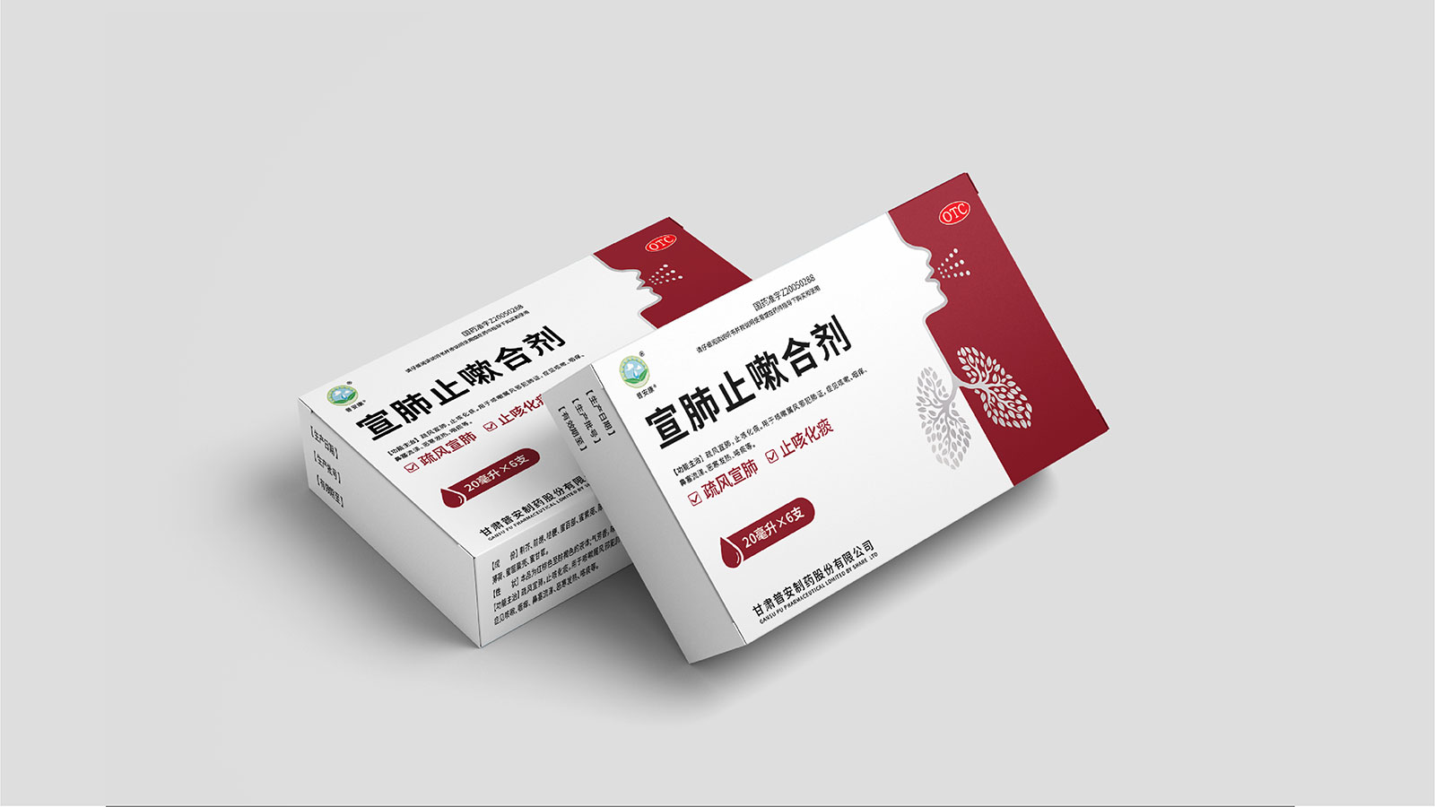 包裝整體風格以極簡為主,在凸出產品通用名的同時,將產品核心主治功能——疏風宣肺、止咳化痰以簡潔圖案展示于畫面,并作為畫面核心視覺元素。產品成分以中草藥為主,又聯想到產品功能主治特征,顧將兩者結合,用代表中草藥的樹葉和肺的整體形態進行融合、替換,凸顯產品中成藥屬性,將肺、呼吸道、人物側臉剪影和代表呼吸感的小點相結合,呼應產品主治功能特征。考慮到產品性狀為液體形態,因此將代表液體的水滴形態融合畫面和產品規格相結合,并做強調處理,凸顯產品性狀的同時以便于消費者準確查看及區分產品不同規格。